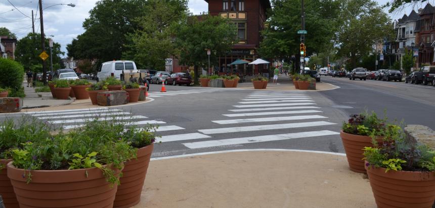 Last week, University City District completed a new pedestrian plaza that they are calling Baltimore Crossing. The new pedestrian plaza greatly improves walkability at 48th and Baltimore. As PlanPhilly reports, the five-pointed intersection was “notoriously wide [and] difficult to cross.” Now, the intersection is now replete with planters and stone barriers on painted bump-outs that are connected by freshly painted crosswalks. Bump-outs are a common traffic-calming feature that make intersections safer for pedestrians by slowing cars down and reducing the amount of time it takes to cross the street.