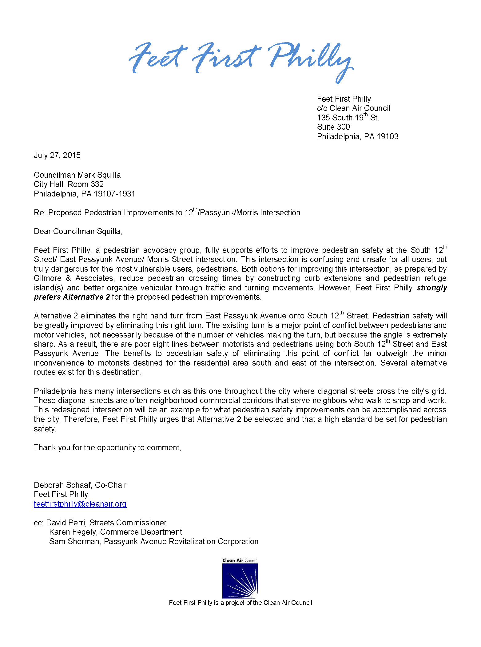 Feet First Philly strongly prefers Alternative 2 for the proposed intersection improvements. This alternative is clearly safer for pedestrians as it removes a major point of conflict between cars and pedestrians (a sharp right hand turn from East Passyunk Avenue onto South 12th Street. You can see the drawings here and read our letter in full below.