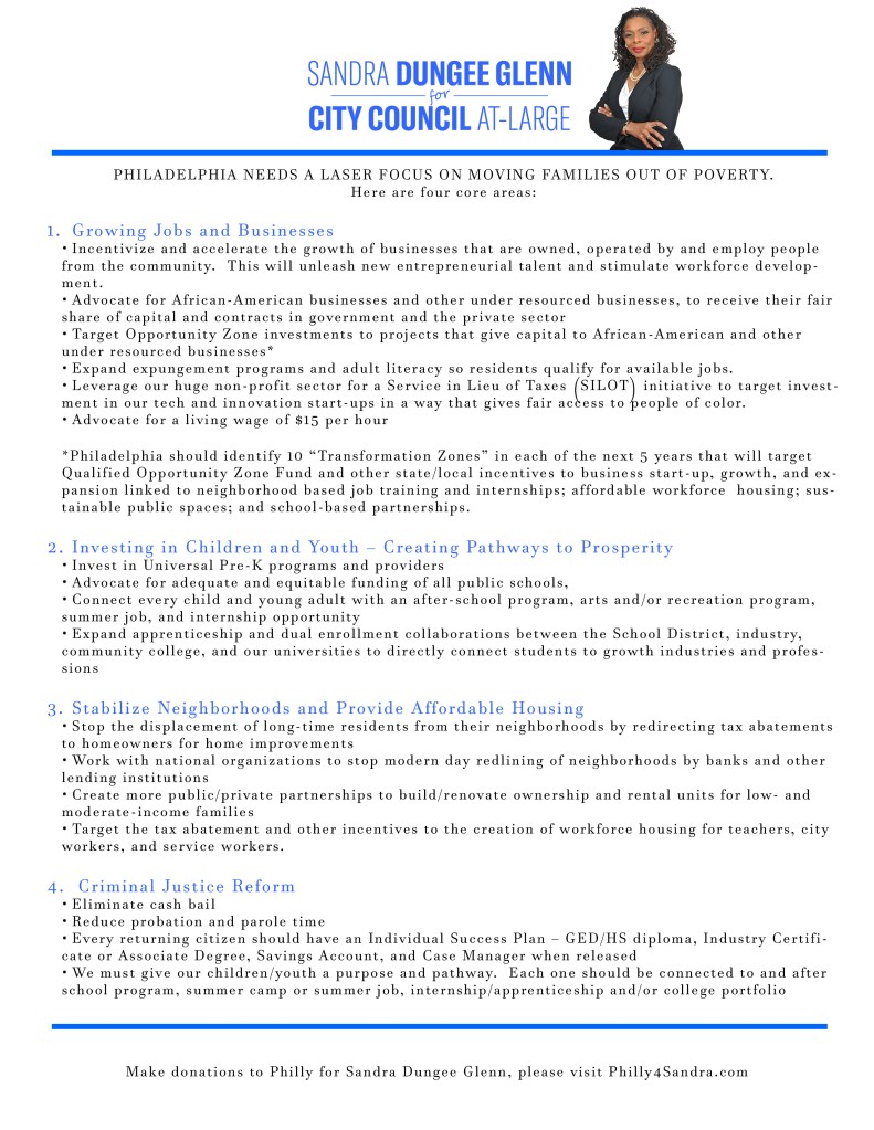 However, I do want to share some information about my background and agenda. I hope to have the opportunity to serve on City Council and help shape the legislative and fiscal agenda that ensures all Philadelphians are part of vibrant, healthy, sustainable communities. To that end, I am attaching my campaign platform, resume, and bio for your review.