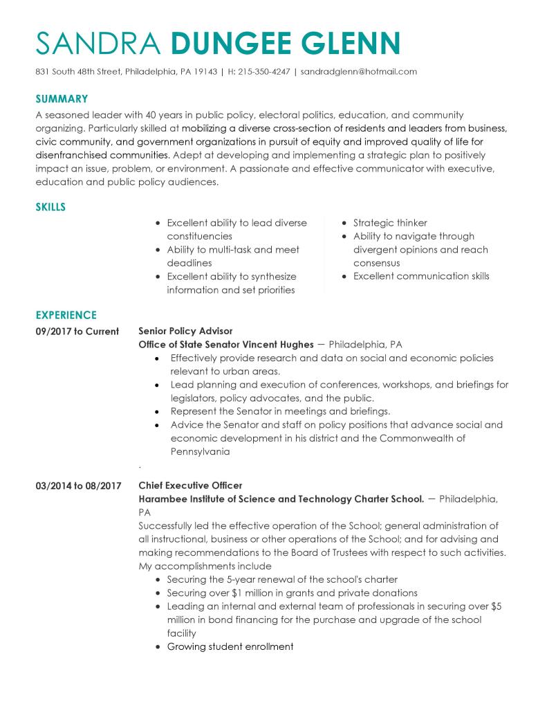 In lieu of a questionnaire, At-Large Candidate Sandra Dungee Glenn sent over a resume, bio, and campaign platform instead of the survey.
