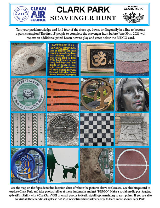 To learn more about Clark Park, download our BINGO card, explore the park, and find the landmarks on the bingo card. Submit your entry by tagging @FeetFirstPhilly on Twitter, and Facebook, and using the hashtag #VSHClarkPark or email your pictures to feetfirstphilly@cleanair.org. We have a special prize for the first 15 entries, so download our BINGO card NOW and start exploring Clark Park.