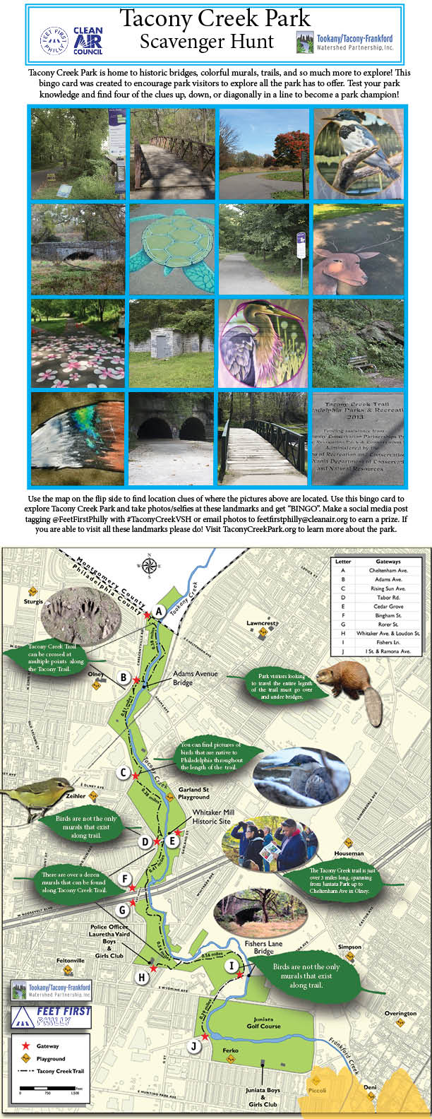 To learn more about Tacony Creek Park, download our BINGO card, explore the park, and find the landmarks on the bingo card. Submit your entry by tagging @feetfirstphilly on twitter and facebook and @feet_first_philly on Instagram.Use the hashtag #VSHTaconyCreekPark, or email your pictures to feetfirstphilly@cleanair.org. Prizes are available for all participants, so download our BINGO card NOW and start exploring Tacony Creek Park.