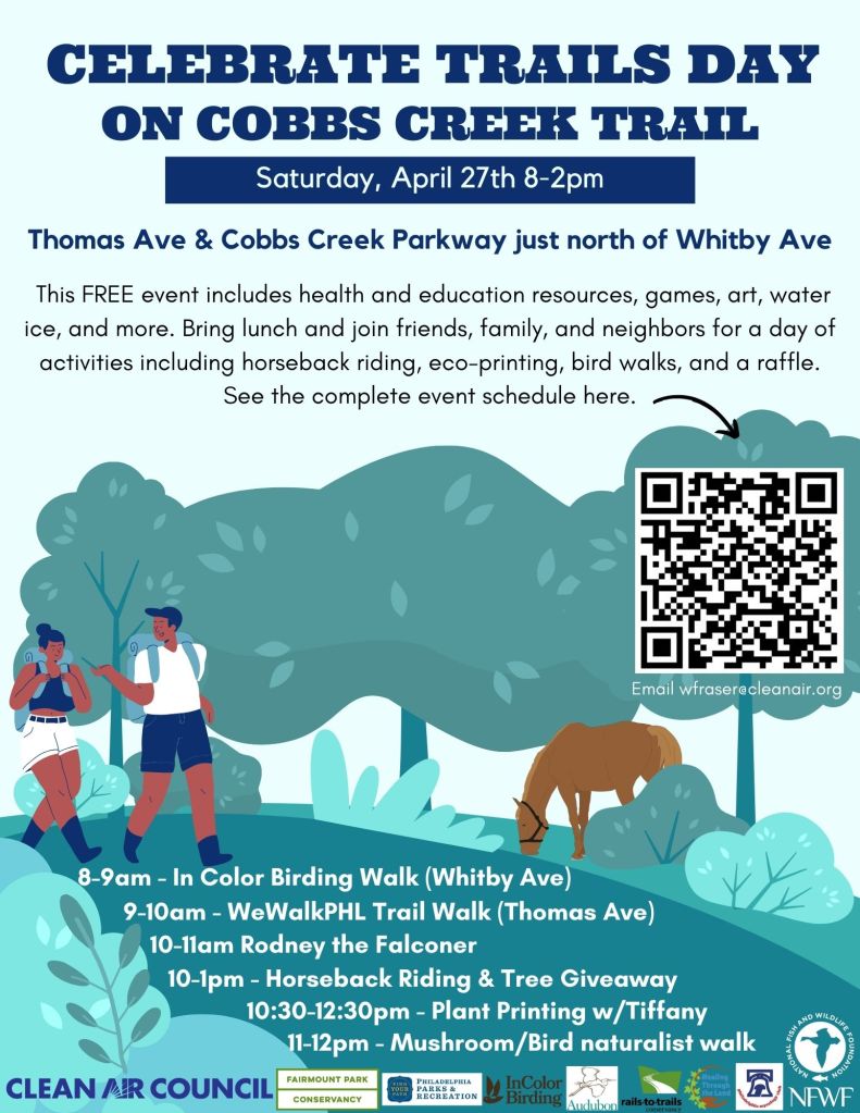Join Clean Air Council and Fairmount Park Conservancy for the fifth annual Celebrate Trails Day along Cobbs Creek Trail on April 27th from 8am-2pm at the playground/park area at Thomas Ave & Cobbs Creek Parkway just north of Whitby Ave. This free event will kick off with two walks from 8-10am and then be joined by exhibitors from 10-2pm to provide free health and education resources, games, and more. The day is filled with free activities including horseback riding, a birding walk, plant identification workshop, and raffle. See the complete event schedule below and don’t forget to invite your friends, family, and neighbors to join for a full day of fun on the trail and in the park.