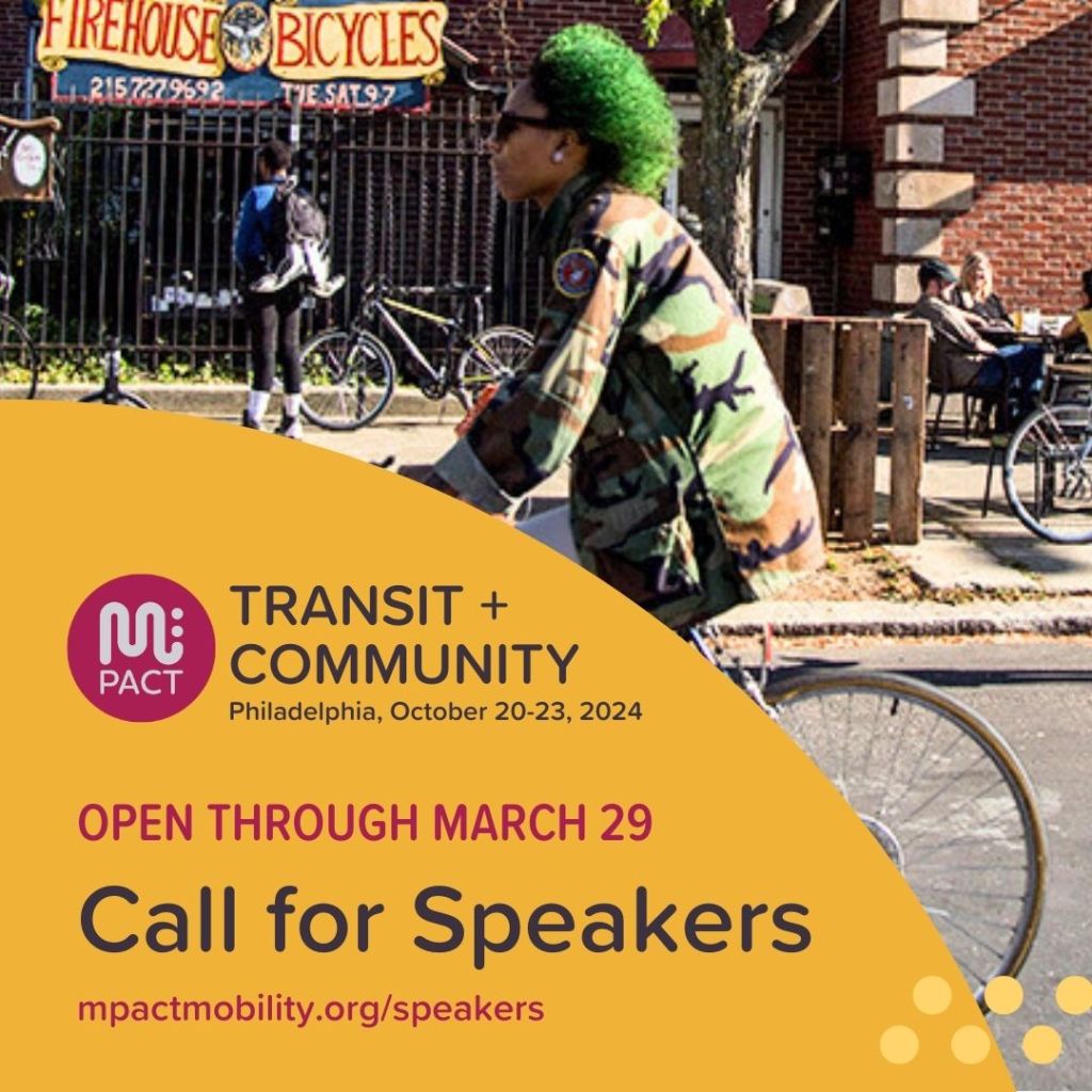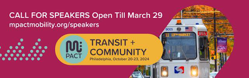 The 2024 Mpact Transit + Community Conference (formerly Railvolution) will be in Philadelphia from October 20-23. People interested in speaking and being a Mobile Workshop Leader is open until March 29.
