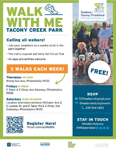 Tacony Creek Park hosts three weekly free walks on the trail. These occur every Thursday, Friday, and Saturday. Registration is required. Learn more about Tacony Creek Park’s free walking program called Walk With Me. You can visit the Tookany/Tacony-Frankford Watershed Partnership Inc. event page and find other events you can participate in this Spring.